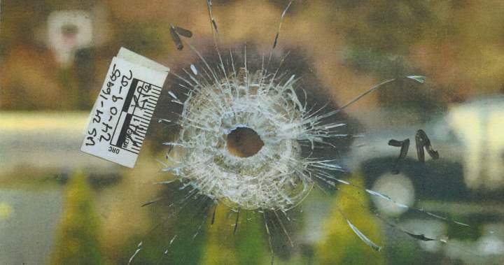 Nusikaltimų scenos nuotrauka rodo kulkos skylutes „Bishnoi Target“ namuose, Colwood, BC, 2024 m. Rugsėjo 2 d.